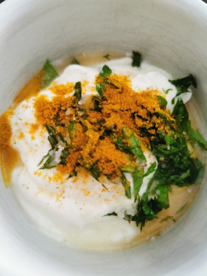- Réaliser la sauce en mélangeant le yaourt grec, le curry et la menthe, le jus de citron et le sel. Mélanger. Réserver