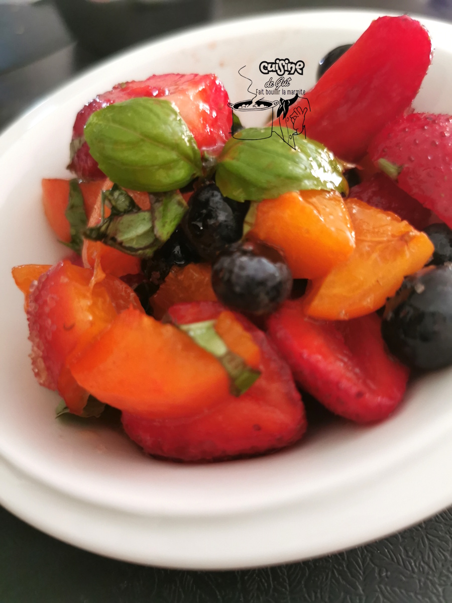 Bonjour !! Mon amie Viviane du super blog Quoiqu’on mange, ne publiait presque plus ces derniers temps. Mais voilà que, juste avant que je ne parte, elle publie un dessert tout à fait adapté à mes goûts. Quelle vilaine tout de même, vu que je partais ce n’était pas le moment de faire des courses. Ce dessert qui avait titillé mes papilles était simplement, une salade de fruits ! C’est tellement bon les fruits ! Parfumée comme elle l’avait fait de basilic et d’huile d’olive hummm ! il me tardait de la goûter à mon retour.