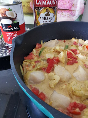 Colombo de poissons chou fleurs à la crème coco et rhum arrangé banane