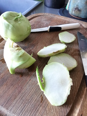 - Eplucher Les choux rave. Pour cela les couper en grosses rondelles, puis retirer le dessus car c’est difficile à éplucher. Les couper ensuite en morceaux