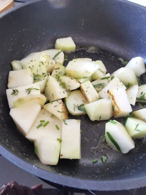 | Franchement il faut que je pense plus souvent au chou rave ! Cuisiné ainsi j’ai obtenu une délicieuse poêlée qui s’est fort bien mariée avec mon saumon. J’ai vraiment beaucoup aimé ce petit goût un peu acidulé rendu par le vinaigre et le parfum des herbes. Je compte bien le refaire ! |