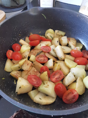 Mais ce jour là, j’ai eu envie de les faire plus simplement. Alors quoi de plus facile qu’une poêlée de légumes ? J’y ai ajouté un peu de pommes de terre et quelques tomates cerises et pour donner un bon petit goût, j’ai ajouté un peu de Vinaigre balsamique blanc, du sucre et un peu d’estragon. C’est mon saumon qui a eu l’honneur de tester cet accompagnement !