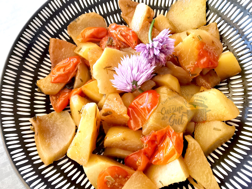 Ma soeur Ewa est une grande fan de chou rave qu’elle achète pratiquement chaque semaine ! elle l’utilise en râpé comme pour les carottes, moi, ce légume me laissait indifférente, mais pourquoi pas le tester en braisé je crois que ça me plairait