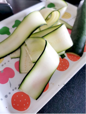 - Régler la mandoline le plus finement possible et tailler les courgettes dans leur longueur.