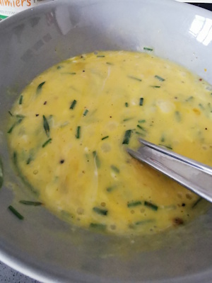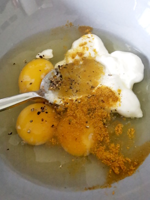 - Casser 3 oeufs dans un saladier, ajouter 2 cuillères à soupe bombées de crème épaisse. Ajouter le curry, saler et poivrer. Ajouter l’estragon et battre les oeufs à l’aide d’une cuillère magique ou un fouet.
