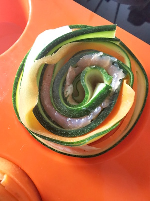 - Empiler 5/6 tranches de courgettes, ajouter une bande de saumon et enrouler la courgette sur elle-même.