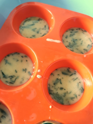 - Mettre une cuillère à café d’oeuf battu dans les empreintes à muffin. Réserver