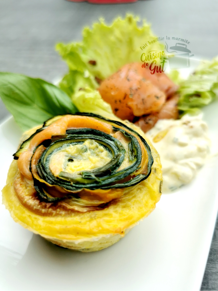 Là il était question de les faire cuire dans un moule à muffin avec un peu d’oeuf battu. J’ai donc réalisé ces muffins en y ajoutant des lanières de carotte, une première fois lorsque j’ai reçu des amis et la seconde fois j’ai compliqué un peu plus l’affaire en ajoutant du saumon fumé Gravelax coupé en lanière. Je dis compliqué car il se manie moins bien que les lanières de carotte mais avec un peu de patience on y arrive. C’est cette version que je vous propose que j’ai servie avec une petite sauce Curry/citron/Estragon dont j’adore les parfums.