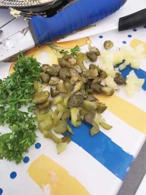 • Ciseler, au couteau, le cornichon, les câpres, le citron confit puis mettre le tout dans un bol.