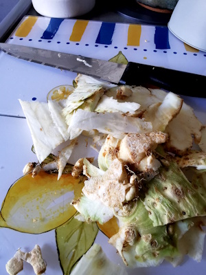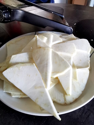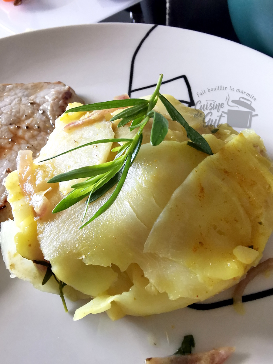 Au lieu de réaliser des tranches épaisses, mon mari n’était pas là pour les couper, je me suis souvenue que dans Top chef, lors de la réalisation d’un plat, il avait été coupé à la mandoline. Je n’ai toutefois pas pu réaliser de belles tranches rondes et régulières car je n’ai pas pu lors de l’épluchage lui donner une belle forme. D’autant plus que j’en avais déjà coupé un morceau et que ma boule n’était pas entière, il m’en restait un morceau équivalent d’une demie boule mais il avait une drôle de forme. Du coup, j’ai essayé de lui donner une petite présentation pour que l’on ait envie d’y goûter, c’est important car je sais que tout le monde n’aime pas le céleri.