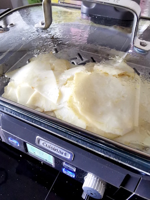 | 1- Le fait de cuire le céleri à la vapeur permet, outre le fait qu’il est bien meilleur cuit ainsi, de diminuer le volume. Si vous n’avez pas de grosse cocotte, faites le cuire comme ça. Bien sûr si vous ne possédez pas de cuit vapeur, faites les cuire directement en cocotte mais là à feu très doux et avec un peu de liquide ou vin blanc pour ne pas qu’il attache et surveillez ! Prévoyez dans ce cas du temps car ce sera long à cuire. |