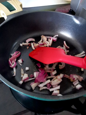 - Eplucher l’oignon rouge, et le ciseler. L’ajouter dans l’huile chaude et le faire revenir.