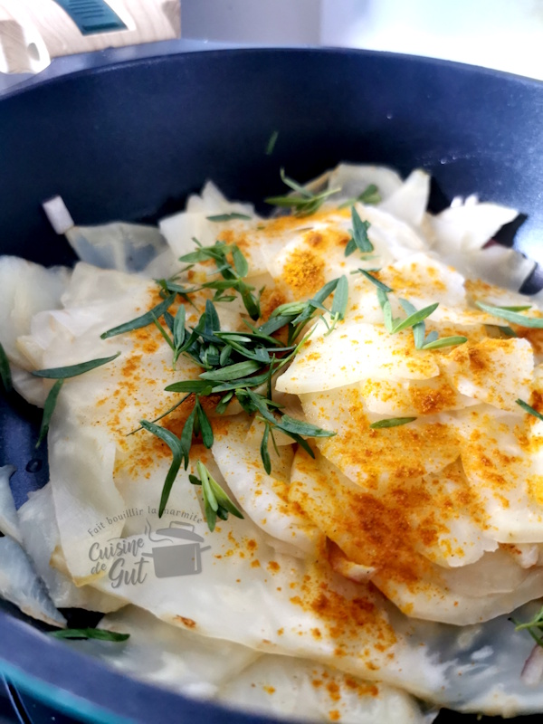 Bonjour !! Voilà aujourd’hui un plat de légumes que je voulais tester depuis un bon moment. Je m’étais formidablement régalée avec mes tranches de céleri et tomates prunes que j’avais réalisé avec du curcuma. Cette fois, j’avais envie de tester le Curry avec. Seul, le fait que j’ai du pendant de longs mois éviter ce qui était relevé m’a retenu car je n’en ai pas du doux. Ca va mieux, alors comme le céleri arrive à son apogée, j’ai comblé mon envie en utilisant mon curry des Aztèques effectivement assez fort. J’ai également eu envie d’y ajouter de l’estragon, cette herbe si agréablement parfumée qui donne à tout ce que l’on cuisine, une saveur vraiment gourmande.
