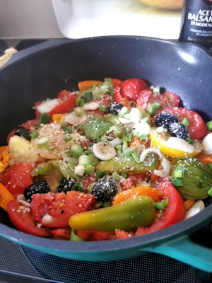 2- Surveiller la cuisson ! En été les tomates sont extra et ne rendent pas trop d’eau, avec le vinaigre Balsamique, le tout caramélise un petit peu, alors il ne faut pas que les légumes brûlent..