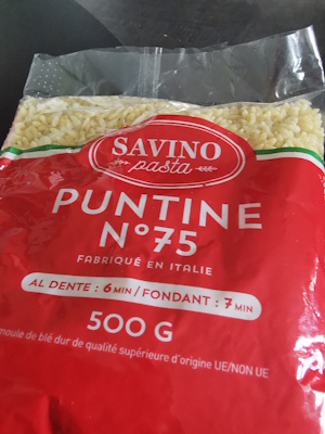 Bonjour !! Je ne sais pas si vous connaissez les pâtes Puntine. Moi non, j’en apprends tous les jours. Celles que j’ai achetées ressemblent tout à fait aux pâtes Orzo, ou langues d’oiseau, mais en plus petit calibre, on voit bien la différences lorsqu’elles sont crues. Ce sont des pâtes parfaites pour remplacer le riz et donc faire soit un semblant de Risotto comme mes Boulettes d’agneau et langues d’oiseau en risotto (plat que j’adore soit dit en passant), ou faire un semblant de paëlla comme mes Langues d’oiseau aux saveurs de paëlla. Comme ces Puntine sont plus petites que les langues d’oiseau, la ressemblance avec le riz est encore plus prononcée.