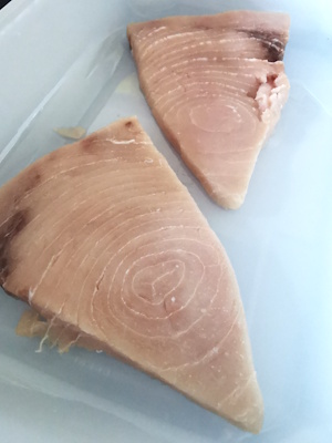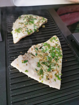 1- Ma tranche d’espadon était très grosse, pour nous deux cela faisait de trop. Au lieu de la couper en deux, j’ai préféré la couper dans son épaisseur, ce qui fait que le temps de cuisson a été largement raccourci. Ajustez donc celle-ci en fonction de vos goûts et de l’épaisseur du poisson.