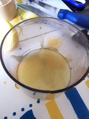 • Mélanger le jus de citron avec l’huile d’olive et une cuillère à soupe d’eau.