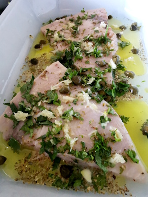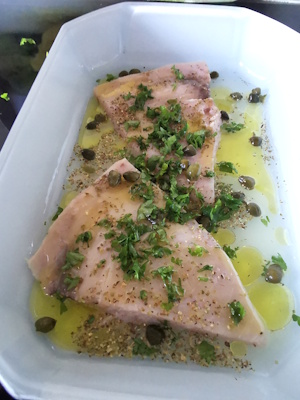 • Placer les tranches d’espadon dans un plat, arroser avec l’huile d’olive/citron