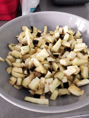 1- Coupez les aubergines, vraiment en petits morceaux. La cuisson au MO est pratique car elle permet de ne pas mettre d’huile, elle peut aussi être faite à la vapeur.