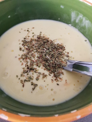 • Casser 2 oeufs dans un saladier, ajouter la crème, fouetter énergiquement et ajouter un l’origan.