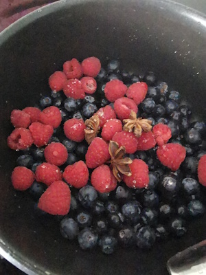 • Ajouter les framboises, puis les étoiles de Badiane et la Cassonade. Ajouter une cuillère à soupe d’eau et laisser cuire à feu doux jusqu’à ce que les fruits soient cuits.