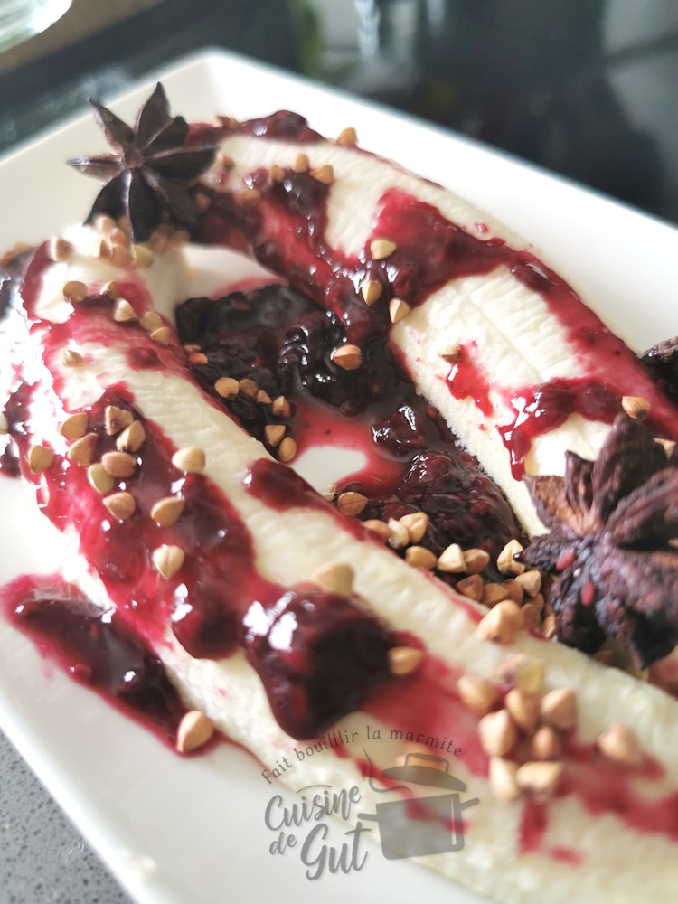 Il s’agit d’un petit dessert sans prétention mais moi je l’ai beaucoup aimé. J’adore la banane, et forcément arrosée de ce coulis bien parfumé et l’ajout du sarrasin torréfié c’était encore meilleur !