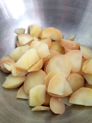 • Eplucher les pommes de terre à l’eau et les couper en rondelles dans un saladier.