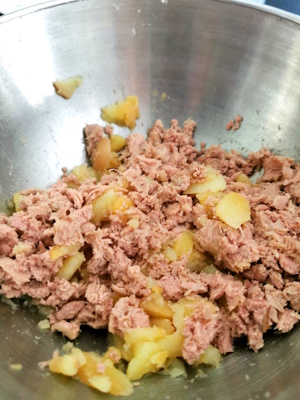 • Egoutter le thon au naturel, puis ajouter celui-ci sur les pommes de terre.