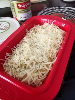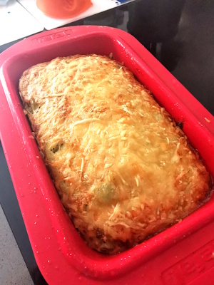 • Remuer le tout avec une cuillère puis verser la préparation dans un moule à cake. Ajouter du comté râpé sur le dessus.