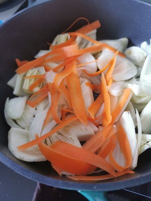 - Mettre un filet d’huile dans une sauteuse et ajouter l’oignon et les fenouil. Les cuire au début à feu vif.