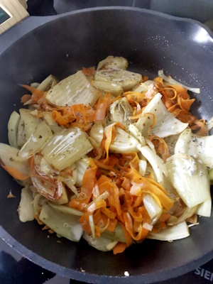 - Eplucher les carottes, les laver et à l’aide d’un économe rasoir, faire des tagliatelles de carottes. Les ajouter au fenouil.
