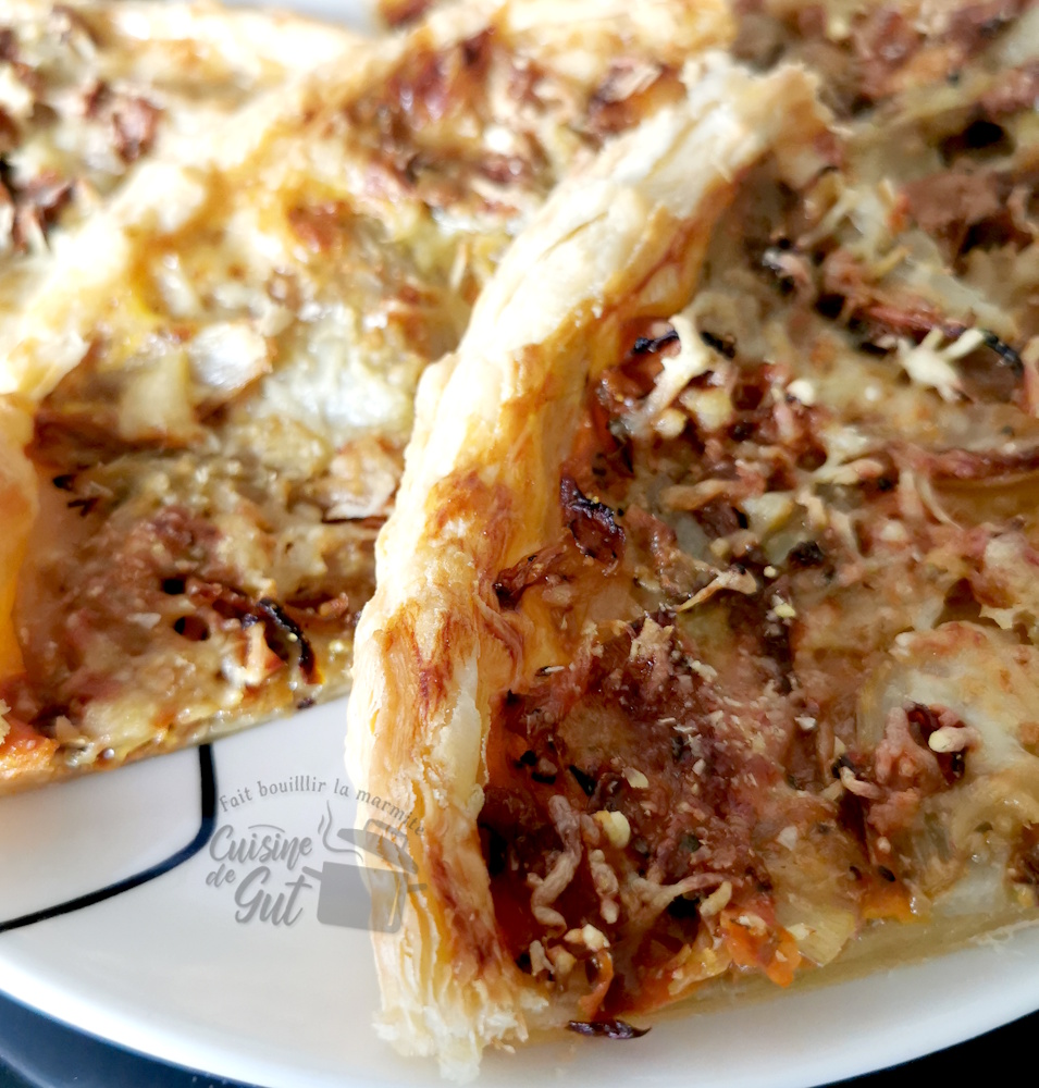 On a bien chacune nos habitudes tout de même ! Tu n’es pas gâtée non plus avec ton fils qui n’aime pas les tartes. Nous c’est toujours en pâte feuilletée. Avant j’avais fait des essais de pâtes brisées mais même si on aimait bien on ne se régale jamais autant qu’avec une bonne pâte feuilletée ! Cette garniture était super du coup je ne regrette pas d’en avoir encore deux parts pour une prochaine fois ! Merci Nat, gros bisous