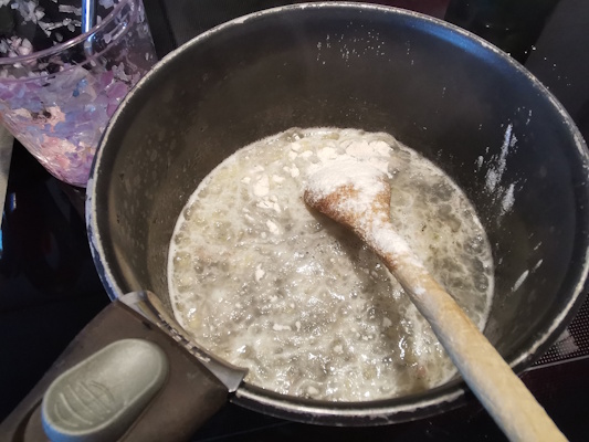 - Verser le vin blanc et l’eau dans une casserole, ajouter la cuillère d’échalotes. Saupoudrer de farine et faire cuire pendant 5 minutes à feu assez fort.