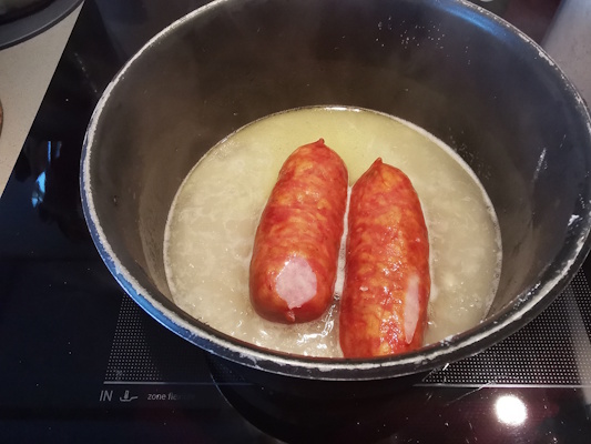 - Ajouter les Diots fumés, baisser le feu et les laisser cuire à petits frémissements durant 20 minutes environ, retirer les Diots et poursuivre la cuisson du vin blanc jusqu’à ce qu’il n’y ait plus beaucoup de liquide.