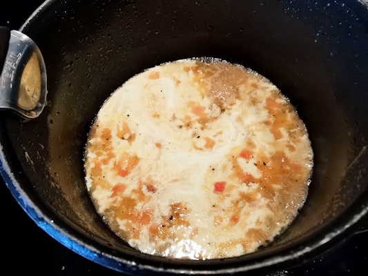 - Verser la crème dans le reste de vin blanc. Mélanger