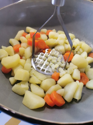 - Lorsque les légumes sont cuits, les mettre dans un grand récipient et les écraser avec un presse purée.