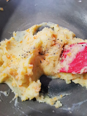 - Ajouter du lait, la crème et un bon morceau de beurre. Poivrer (goûtez avant de saler)
