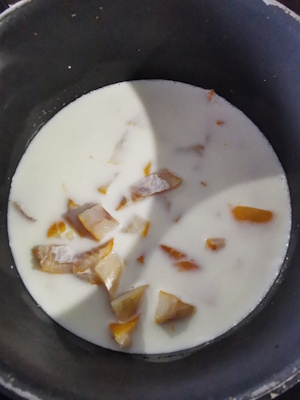 | 2- Mélanger le lait avec de l’eau pour pocher le haddock permet de ne pas attacher la casserole. Laissez le haddock dans la casserole 5 minutes après l’ébullition. . |