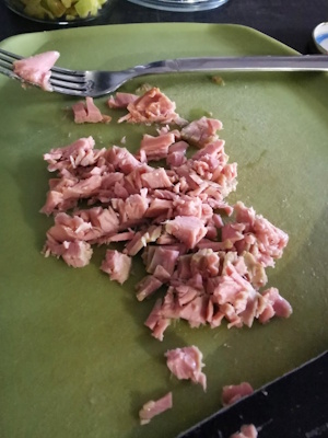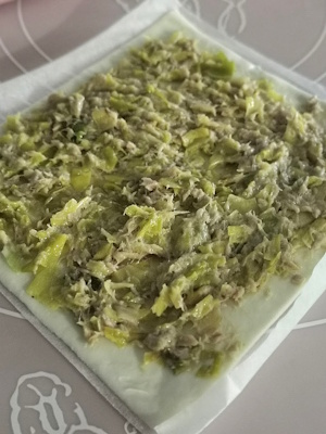 J’ai profité qu’il me restait des poireaux que j’avais fait cuire avec du curry pour l’utiliser en farce. J’y ai ajouté un peu de thon au piment, bien pimenté d’ailleurs et j’ai tout simplement utilisé des carrés feuilletés que j’avais achetés mais pas utilisés. Il me fallait les terminer.