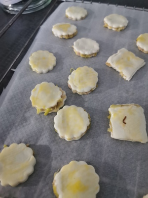 - Mélanger le jaune d’oeuf avec une goute de lait et badigeonner les feuilletés avec.