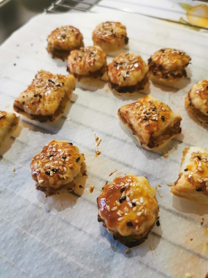 | Alors oui ils étaient congelés mais le fait de le faire dès qu’ils sont froidsa permis qu’ils gardent la fraicheur du feuilletage. Ils étaient bien bons et alternés avec d’autres petites choses à grignoter c’était parfait. Ils ont bien sûr été tous terminés. |
