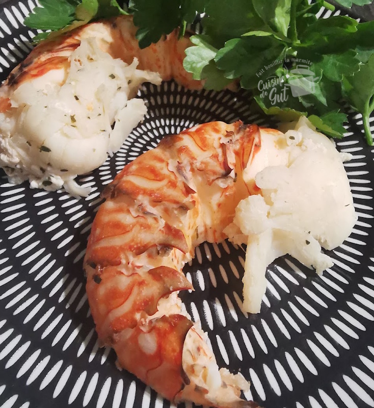 | 1-Na pas faire décongeler la langouste à l’air libre mais la placer au réfrigérateur pour cela. Le temps de cuisson dans le fumet dépend de leur grosseur 10 minutes suffit lorsqu’elles sont petites. Augementer le temps si elles sont plus grosses ou si vous en faites plusieurs. |