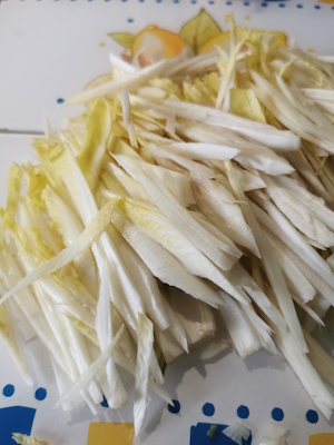 - Retirer les feuilles des endives abimées éventuellement, le trogron et les couper en deux dans leur longueur. Les émincer finement ensuite.
