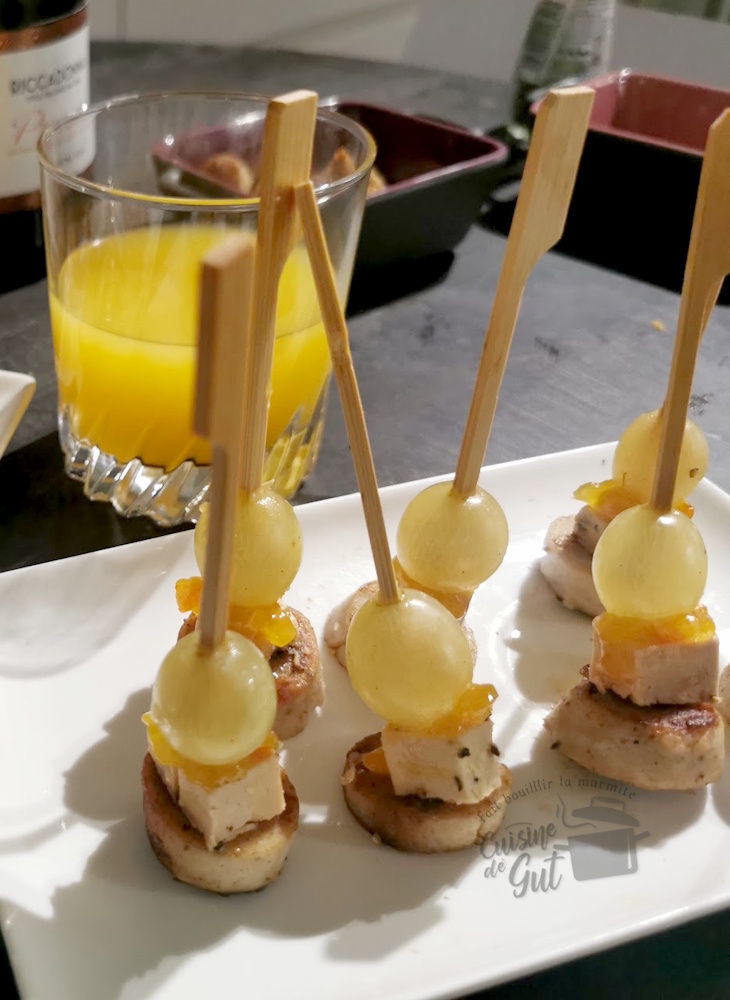 Bonjour !! Aujourd’hui, ce ne sera pas une recette mais simplement une petite idée. En effet, au jour de l’an, pour notre petit apéro en tête à tête, j’avais fait ces petites bouchées qui étaient constituées de rondelles de boudin truffé cuites, surmontées d’un petit carré de foie gras, d’un peu de confiture d’agrumes aux oranges et clémentines le tout surmonté d’un grain de raisin. Ce soir là j’avais commencé de faire des photos mais je me suis vite rendue compte que ça ne valait pas le coup. Trop facile à faire, donc pas suffisamment de photos à faire.