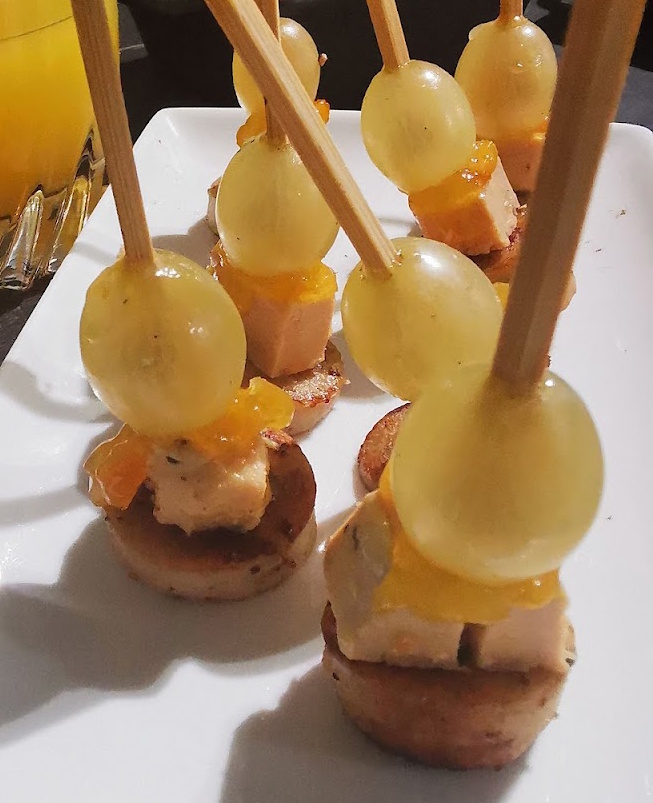 | Nous avons, comme les espagnols mangé 12 grains de raisin au jour de l’an, c’est rigolo mais beaucoup moins vite qu’eux car ça aurait été dommage de ne pas savourer ces bouchées qui étaient super bonnes. Le boudin pour une fois était vraiment parfumé à la truffe et ce contraste avec le foie gras et cette confiture était divin ! Je ne sais pas si cela va nous porter chance mais on débutait bien l’année ! |