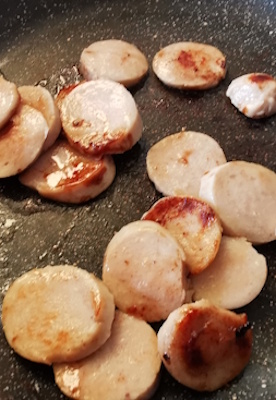 - Retirer le boyau des boudins blancs, les couper en rondelles en prenant soin de les tailler d’épaisseur régulière