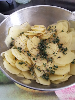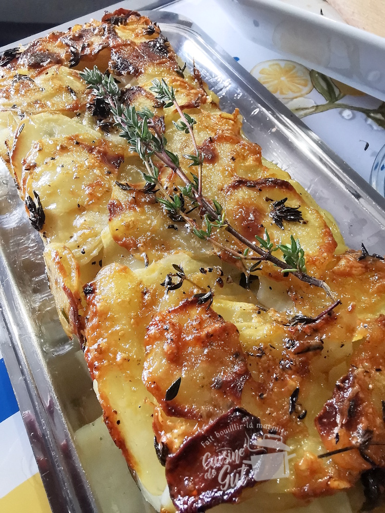 Et pour ton plat, tu sais que chez nous les pommes de terre c’est une histoire d’amour, alors je fonds devant ton gratin, en plus j’ai plein de thym dans le jardin.
