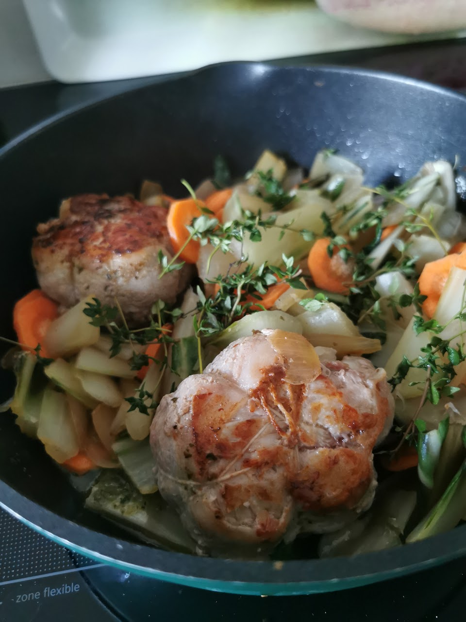 Ce jour là et comme j’avais congelé des cardes de blettes, je les ai ressorties pour les marier avec des carottes et accompagner des petites paupiettes congelées mais dont j’aime bien la farce. J’aime bien cette viande de temps à autre surtout avec une petite sauce comme celle que j’avais faite dans mes Paupiettes de Veau : Sauce aux Cèpes et Purée de Céleri, c’était un régal. Mais bon on ne peut pas toujours faire une aussi bonne sauce. Dans ce cas là je parfume, là c’est avec du thym frais il m’en restait de mon Fondant aux pommes de terre parfumé au thym frais, une chance !