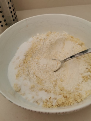 - Mélanger la poudre d’amande et le sucre dans un saladier