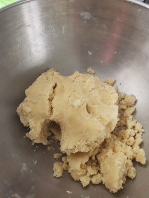 - Mélanger du bout des doigts, puis incorporer l’oeuf pour en faire une boule de pâte